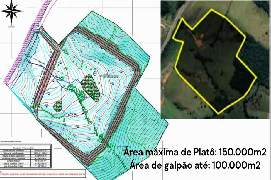 Área total do terreno: 316.295 m² Área máxima de platô: 150.000m² Área de Galpão até: 100.000m²